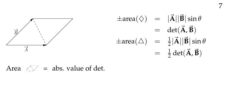 "2 Dimension (차원)에서 determinant (보통 ab - bc 라고 표현하고, 계산한다) = (a,b) 벡터와 (c,d) 벡터로 표현되는 평행사변형의 넓이"