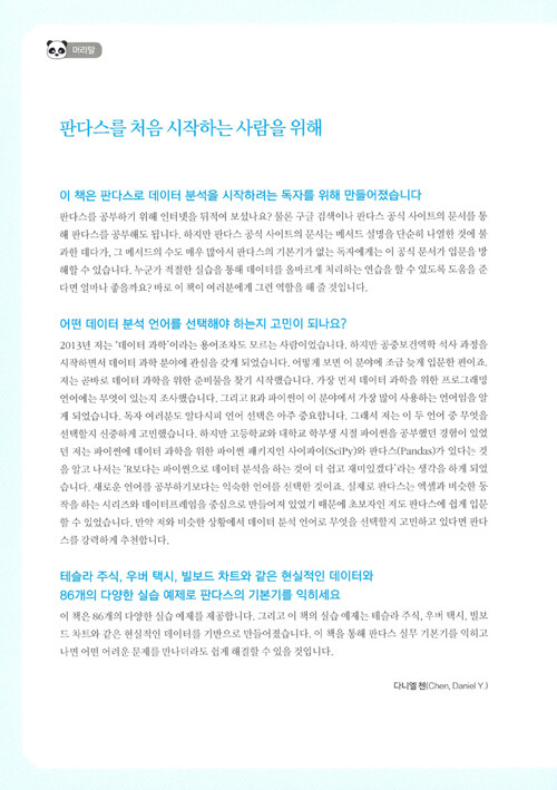 이 책의 저자는 한 책을 기획하고 작성하는 과정에서 어떤 정보를 넣고, 어떤 정보를 제공할 지를 고민하였을 것이다. pandas 입문을 위한 액기스만 딱 뽑아서 정리한 책으로 정말 유용하다.