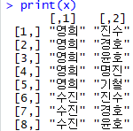 [8,] "수진" "윤호"