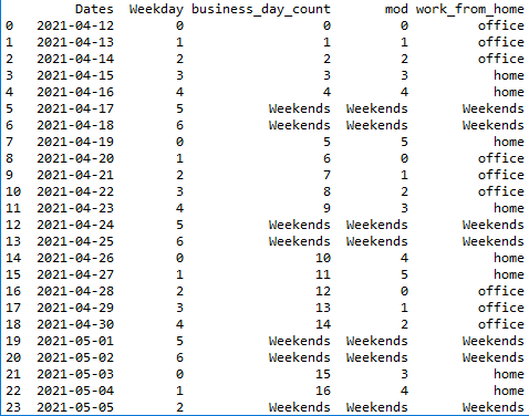 # create a dataframe called 'df' with column names Dates, Weekday, business_day_count, mod_ work_from home